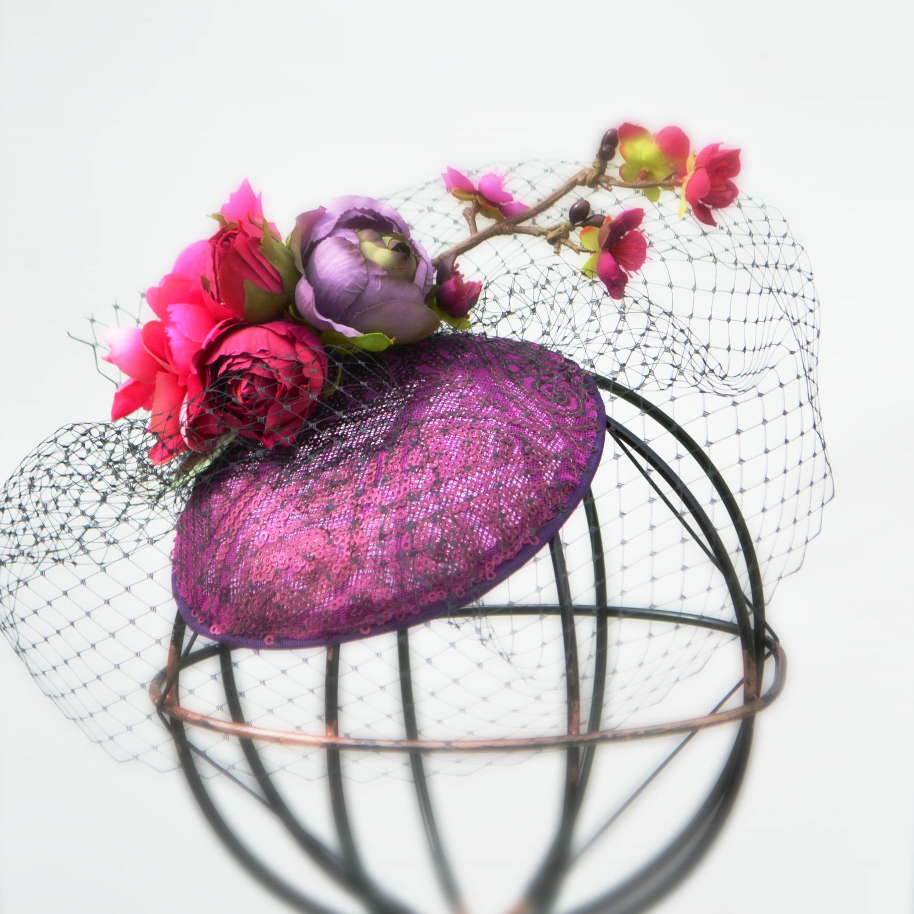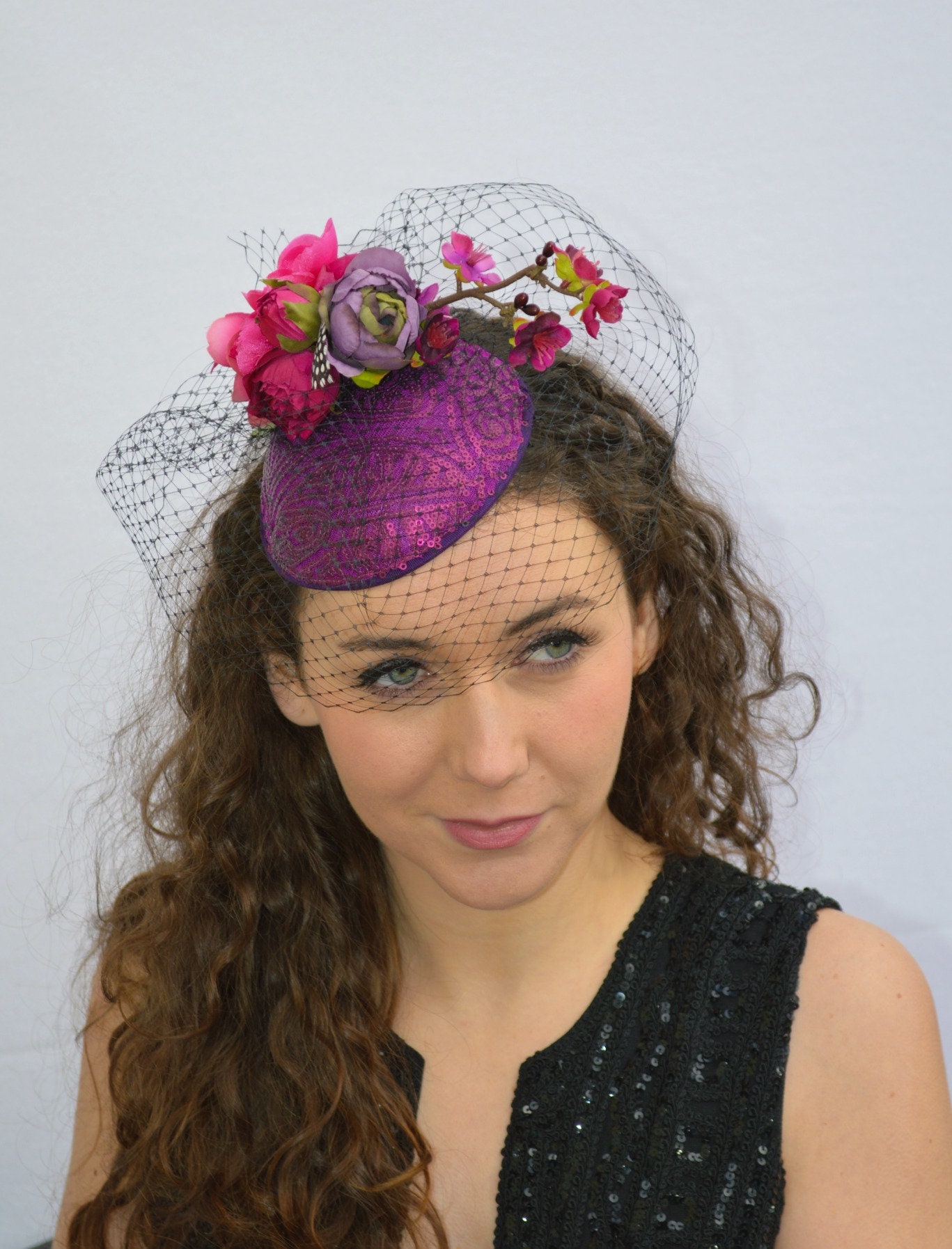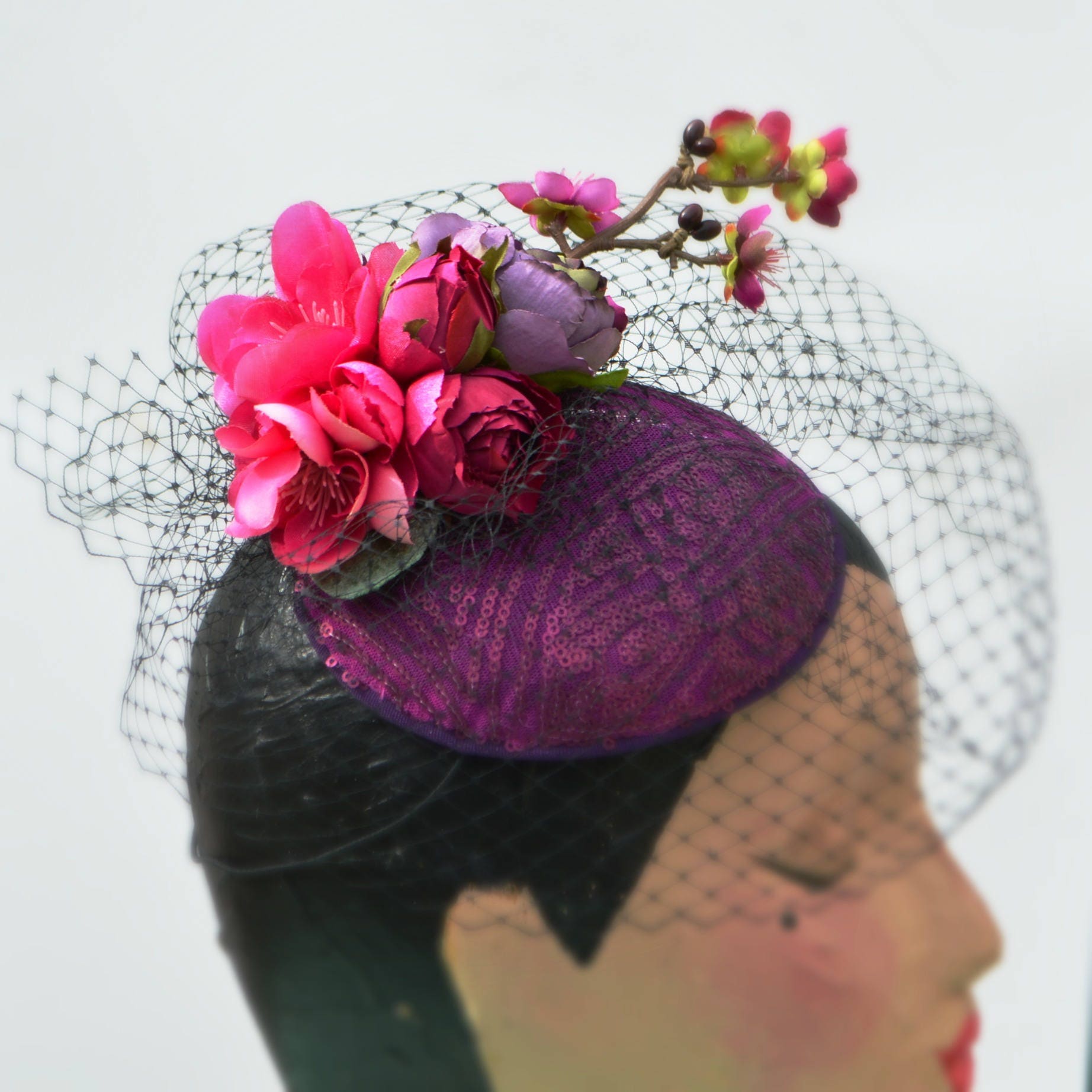 Purple Cocktail hat with veiling, sequinned base and dainty flowers for a glamourous girl.