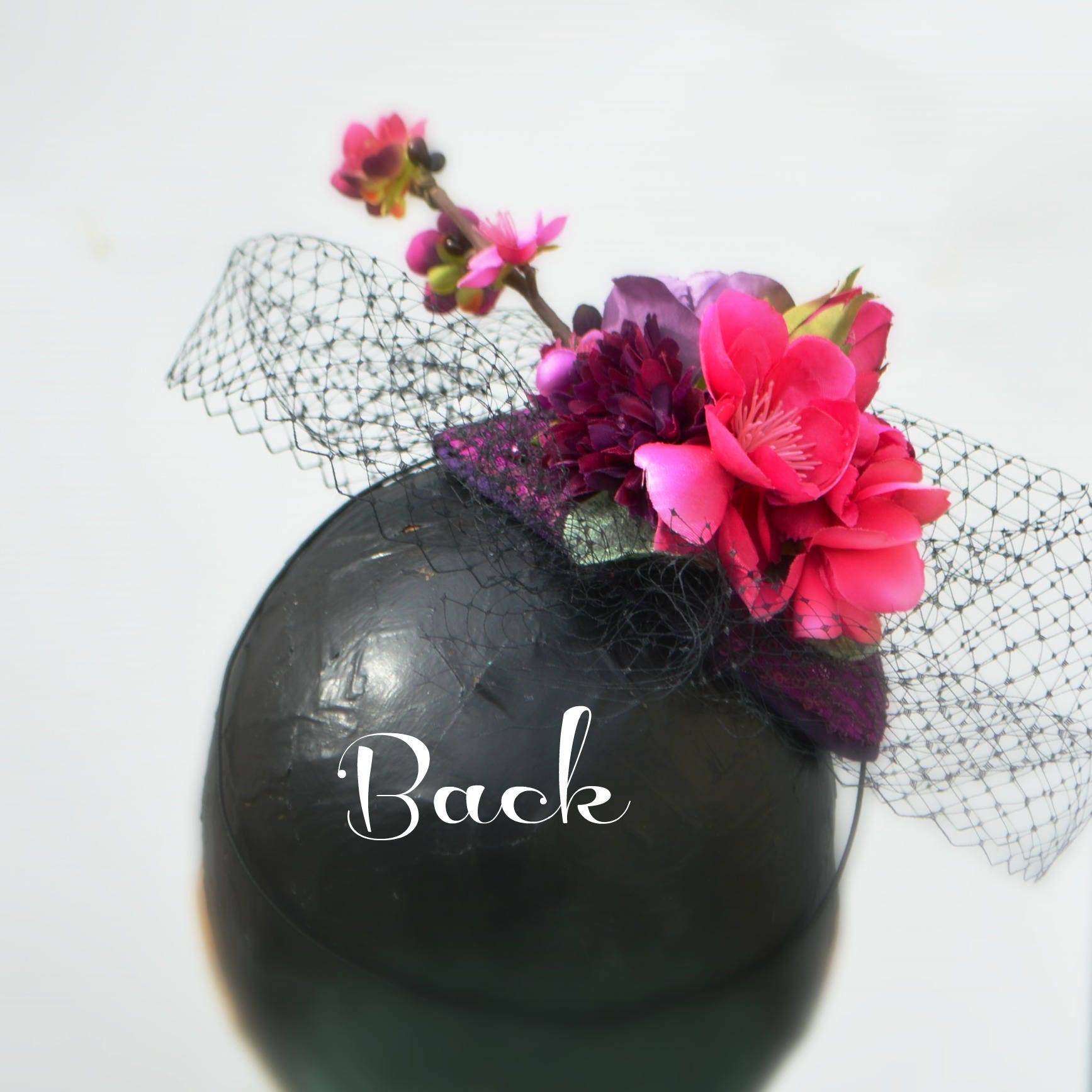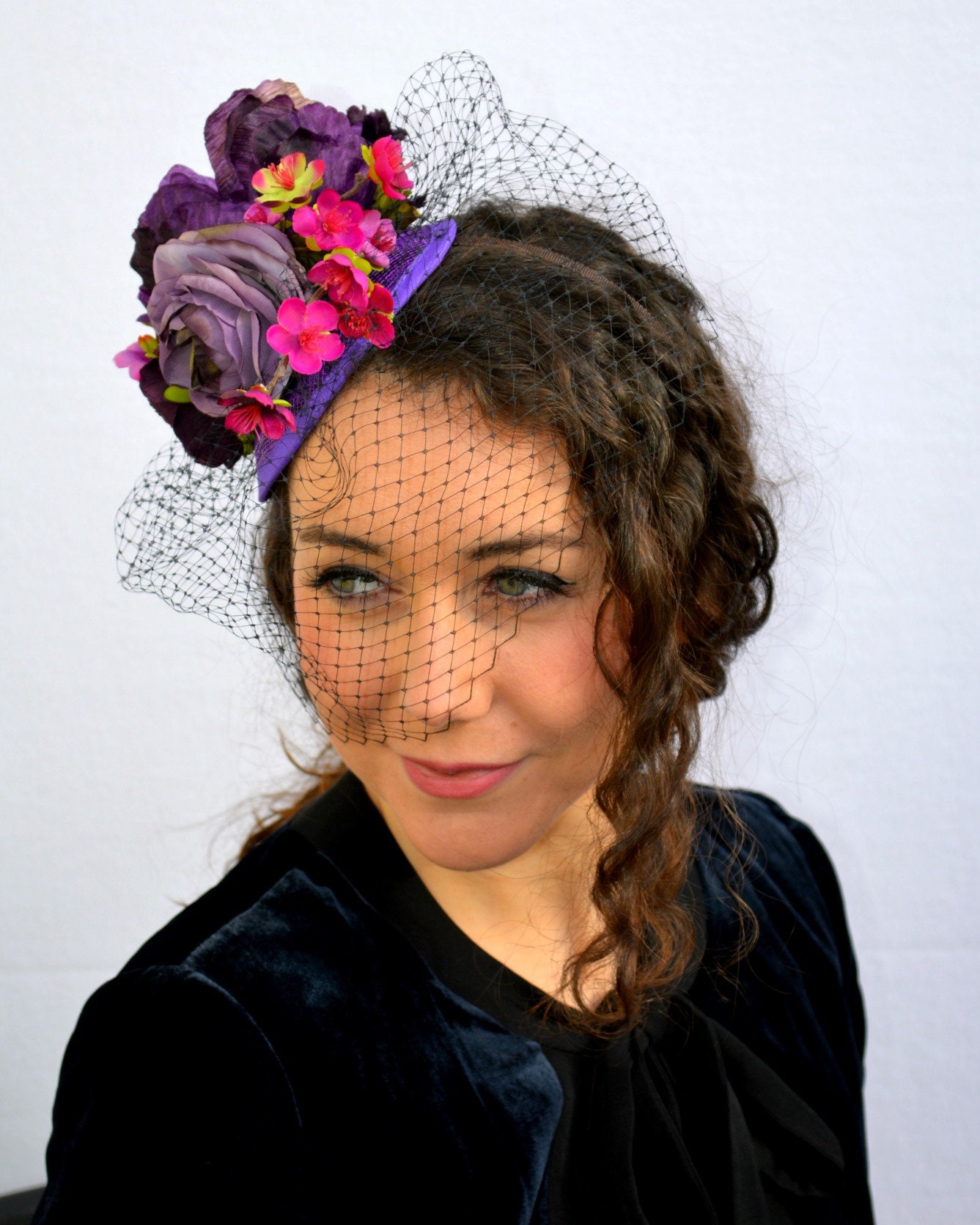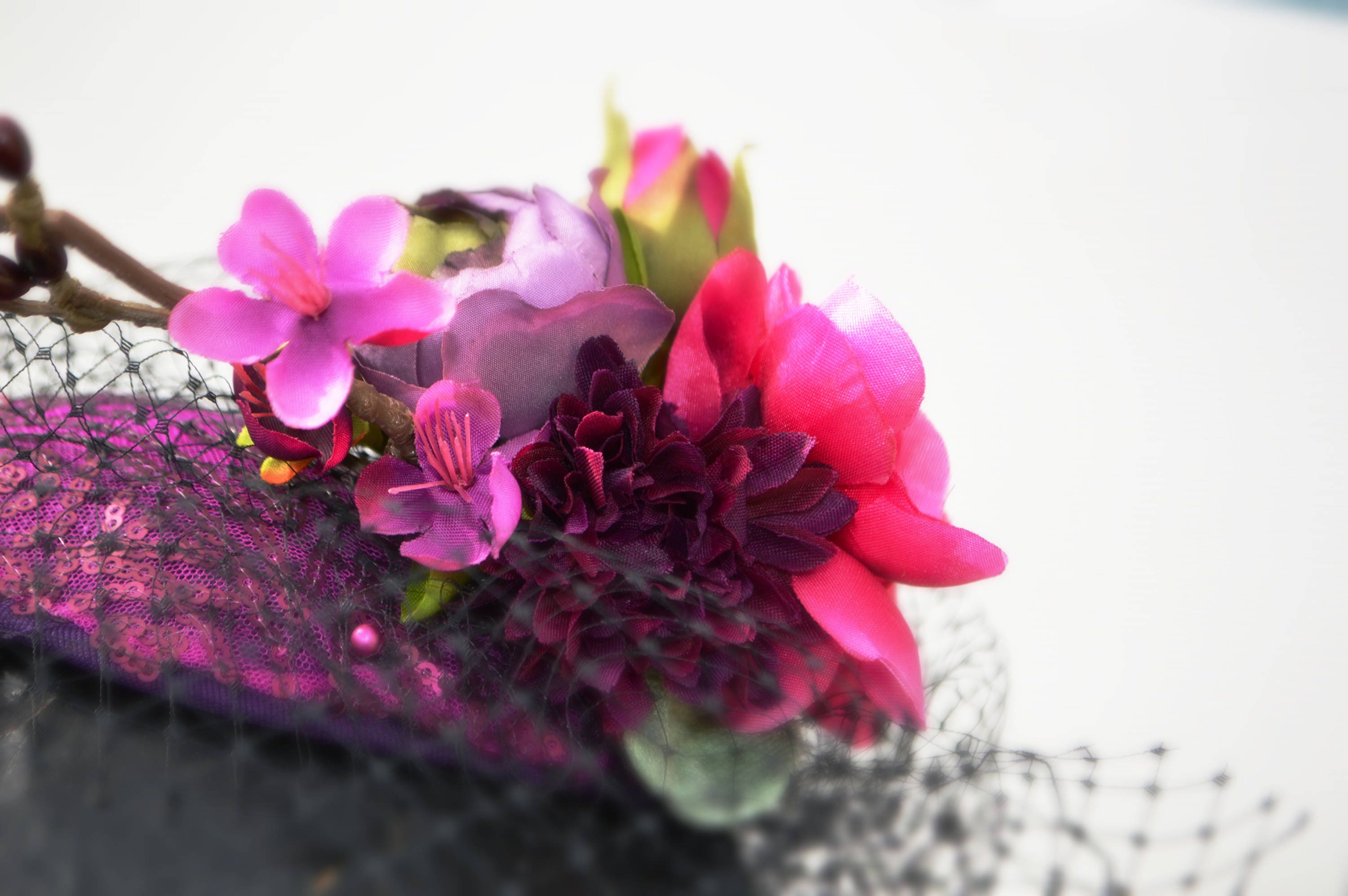 Purple Cocktail hat with veiling, sequinned base and dainty flowers for a glamourous girl.